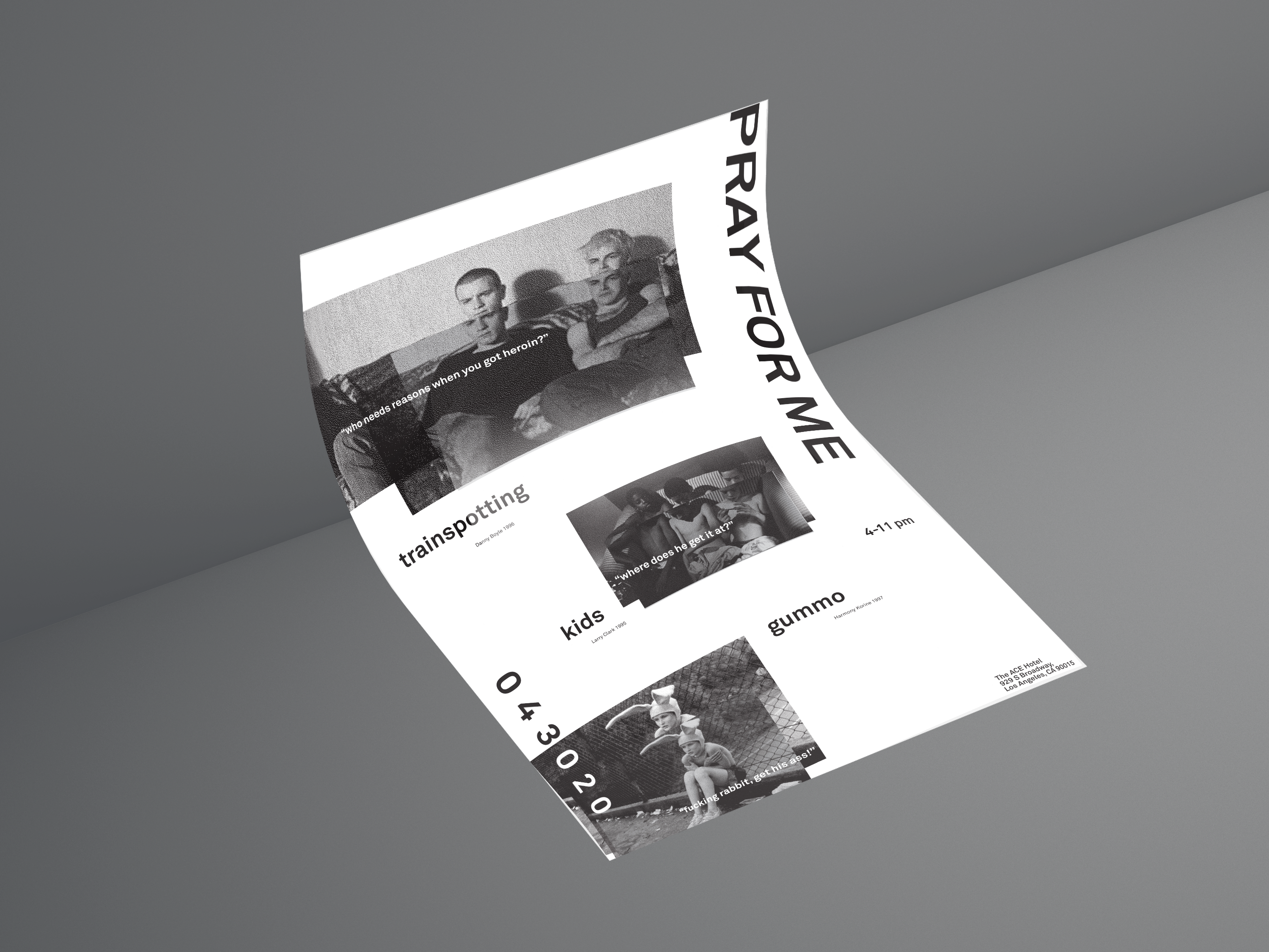 Pray For Me was a triptych poster series revolved around a set of movie screenings in the area of Los Angeles. The poster incorporated static and a dynamic elements. The dynamic portion was activated through a QR code. It allowed the viewer to see the individual animations of each poster through their mobile device. Each animation sequence had a monologue from one of the films in the series.